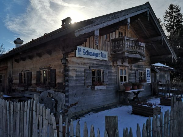 Die Schwaiger Alm hat im Sommer eine große Terrasse. Wirt Anderl Bittig setzt auf Slow Food und Entspannung - und liebt Tiere. In den renovierten Ställen der Schwaiger Alm haben Esel, Hühner, Ziegen und Co., die anderswo nicht mehr gewollt waren, ein liebevolles neues Zuhause gefunden. Hunde sind im Außenbereich und im Gastraum herzlich willkommen - aber bitte an der Leine.
