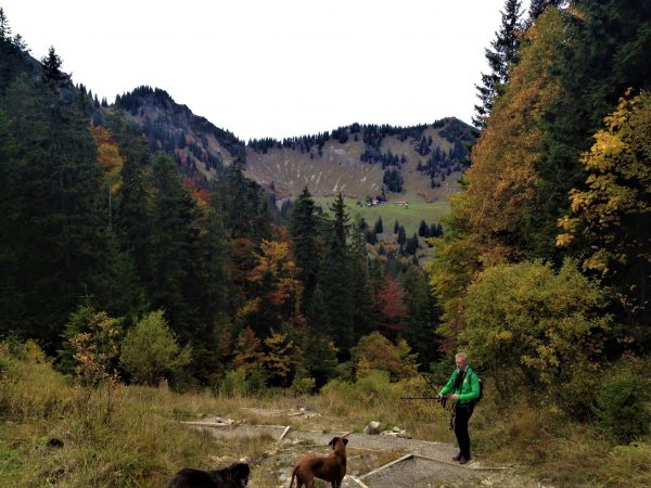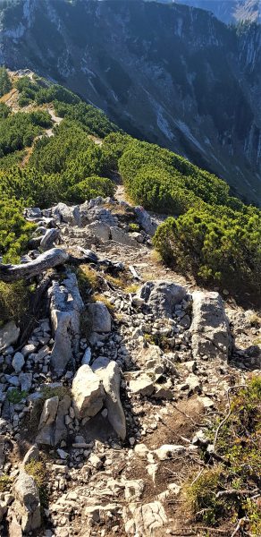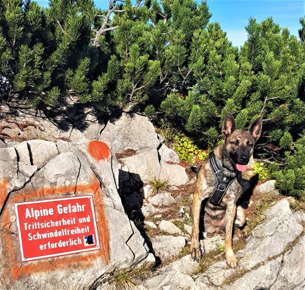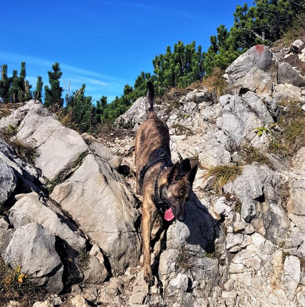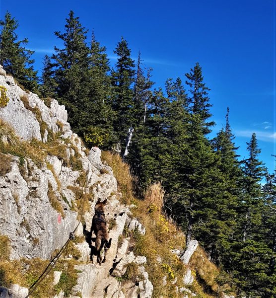 Hinweis: Auf dieser Tour lassen wir den Ostgrat und damit die Brecherspitz samt Gipfelkreuz aus, weil dieser Streckenabschnitt nur bedingt für Mensch und Hund geeignet ist. Wer den Gipfel dennoch mitnehmen möchte, muss schwindelfrei und trittsicher sein und einen bergerfahrenen Vierbeiner haben. Und: Er sollte unterwegs sein, wenn nicht viel los ist. Denn zwischen Vorgipfel und Brecherspitz liegt eine Stahlseil-gesicherte Passage. Wanderer, die Angst vor Hunden haben, können hier kaum ausweichen. Hunde, die Angst vor Fremden haben, auch nicht.