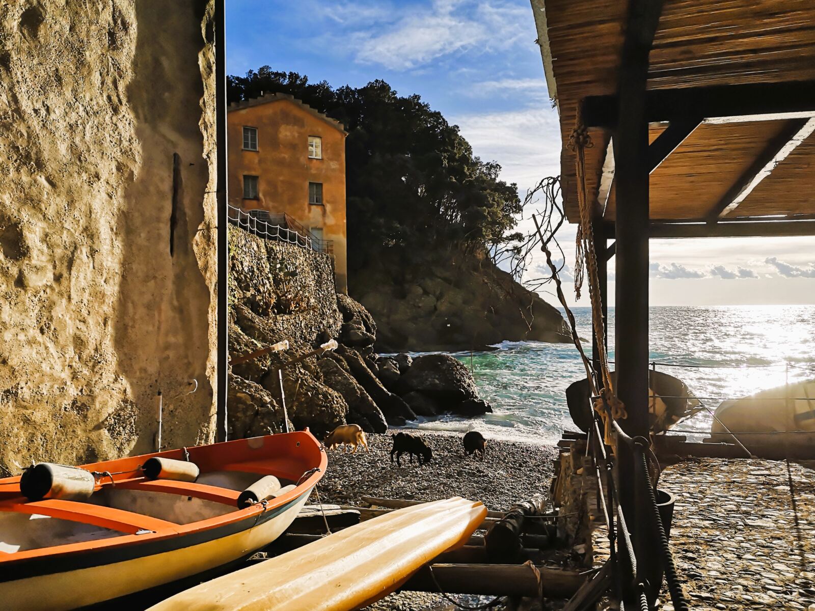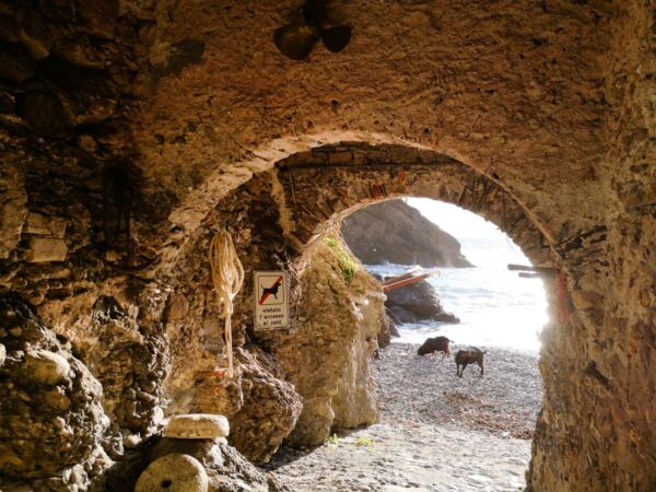 Auf unseren Wanderungen mit Hund entdecken wir hin und wieder Orte, die für immer einen Logenplatz in unserem Gedächtnis bekommen. Zu diesen Orten zählt San Fruttuoso di Camogli, gelegen am Golfo Paradiso zwischen Genua und Portofino. 🤩 Die kleine Bucht zählt zu den Schmuckstücken der Riviera di Levante. Sie ist nur zu Fuß, mit dem Boot oder per Heli zu erreichen. Was die Bucht so besonders macht: vor allem die kunstvoll erhaltene Abtei von San Fruttuoso („Abbazia di San Fruttuoso“, auch „Basilica di Capodimonte“). Der romanische Bau soll im 8. Jahrhundert von Mönchen errichtet worden sein, die sich vor den einfallenden Sarazenen in der Bucht in Sicherheit brachten. Die Abtei schmiegt sich an den schmalen Streifen Land zwischen Berghang und Meer. Seit 1983 gehört das beeindruckende Gebäude mit seinen Bogenfenstern und dem Kreuzgang zum architektonischen Erbe des italienischen Umweltfonds (FAI), der hier zu Führungen und Konzerten einlädt. Zum Klosterkomplex gehören eine Handvoll Häuser, die Cafés, Restaurants und Ferienwohnungen beherbergen. Im Sommer geht’s hoch her in der Bucht. Am Kieselstrand liegen Menschen dicht an dicht. Wir waren im Winter hier, als die heimlichen Herrscher des Orts eine Herde langhaariger schüchterner Ziegen waren. 🐐♥️