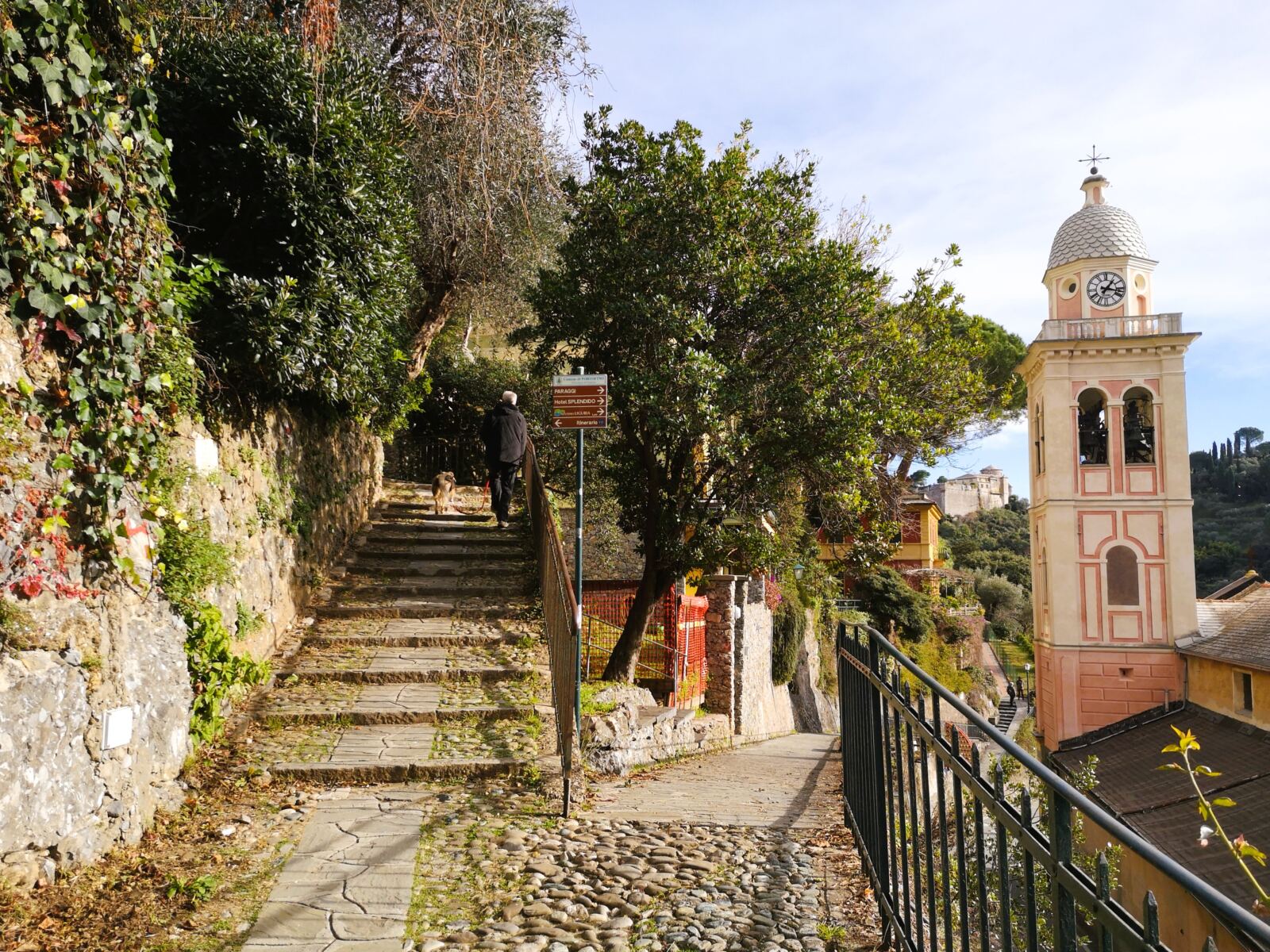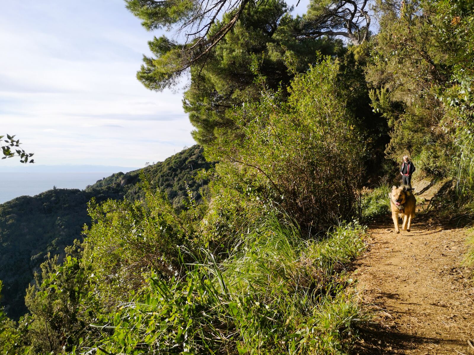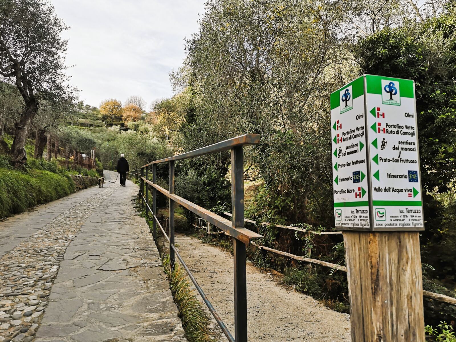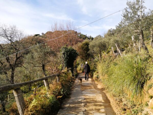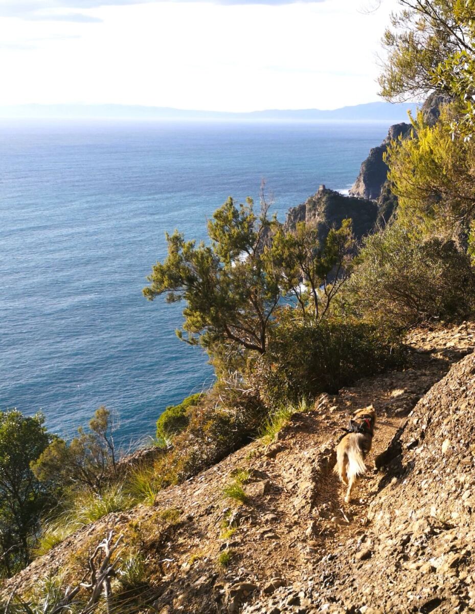 🐕‍🦺In Portofino und Umgebung gilt Leinenpflicht für Hunde. Auf dem schmalen Wanderweg haben wir unseren Amos, der nicht jagt, frei zwischen uns laufen lassen und dann angeleint, wenn wir auf andere Menschen trafen. Im Winter geht das gut, weil dann nur wenige Leute unterwegs sind, unter der Woche nicht mal mehr die Einheimischen.  In der Hauptsaison soll der Wanderweg aber ziemlich überlaufen sein – und der Vierbeiner sollte an die Leine.