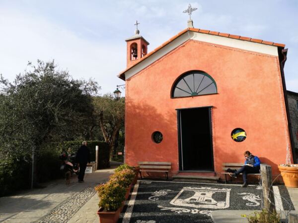 🗺️Wegbeschreibung: Wir starten an der Chiesa Parrocchiale di San Martino. Hinter der Kirche zweigt rechts von der Hauptstraße der baumbestandene Fußweg „Via San Sebastiano“ ab. Er bringt uns steil bergauf, vorbei an prächtigen Anwesen. Der Fußweg mündet auf das gleichnamige Anwohnersträßchen, das sich – schmal und gepflastert – weiter den Berg hinaufzieht. Unterwegs laden Brunnen unseren Hund zum Auftanken ein. Im Sommer muss der Aufstieg ziemlich durstig machen. Vorbei an großen Gärten erreichen wir schließlich die rotgestrichene „Cappella San Sebastiano“. Wir folgen dem Sträßchen vorbei an der Kirche weiter bergauf; den Abzweig nach links hinter der Kirche ignorieren wir.