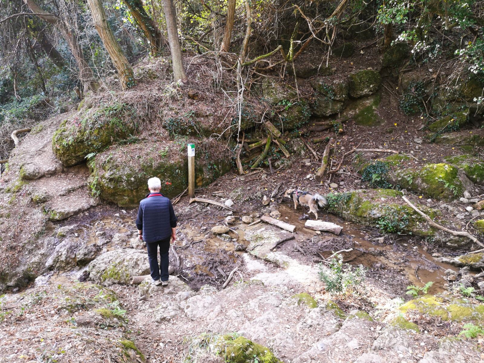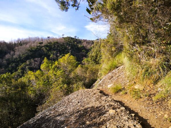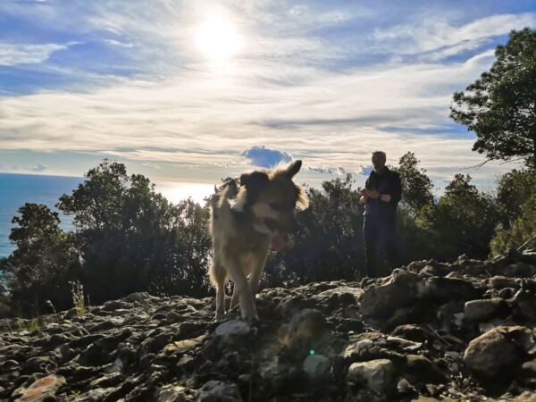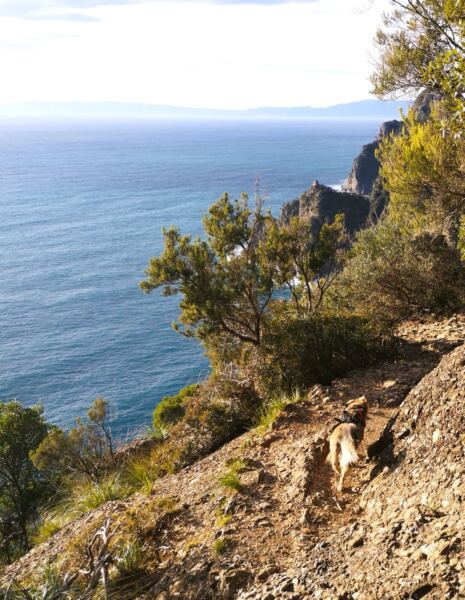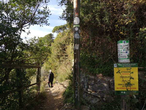 🥾 🐾 Unter Füßen und Pfoten: In Portofino weitgehend glattes Pflaster, auch für Hundepfoten gut zu gehen. Der größte Teil der Strecke verläuft auf mal mehr, mal weniger felsdurchsetzten Waldpfaden. Feste Schuhe sollten sein, vor allem für den Ab- und Aufstieg auf den letzten Metern ab dem Wanderknotenpunkt  „Base zero“.