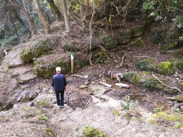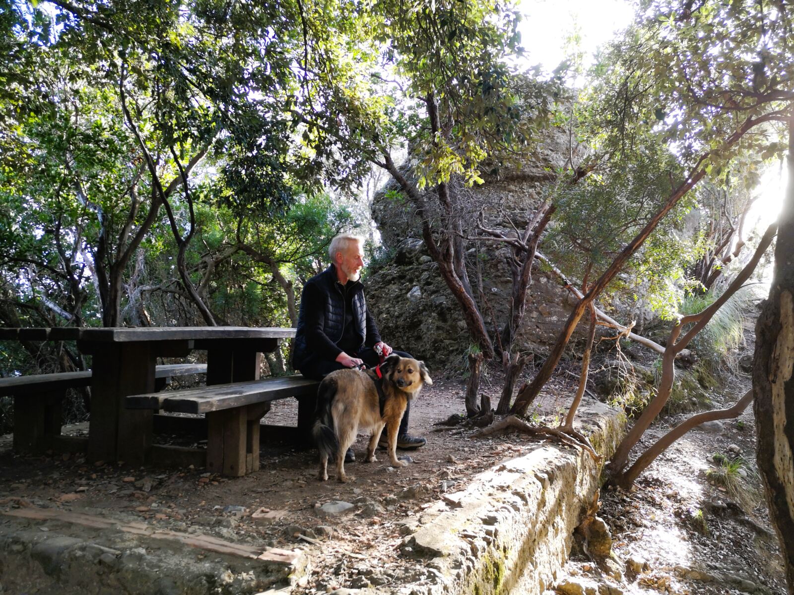 Nach einigen Kurven erreichen wir schließlich den Scheitelpunkt des Wegs an einer Kreuzung mit Picknickplätzen und schönem Blick auf das Meer. Links geht`s nach Portofino über La Cappelletta (den Weg werden wir auf dem Rückweg nehmen), rechts über Il Casone in die Berge. Wir laufen geradeaus über die Kreuzung hinweg und folgen der Pflastenstraße zwischen Gärten mit Olivenbäumen bergab. In der Kurve kreuzen wir einen kleinen Wasserlauf. Unser Amos nutzt die Chance und springt ins Wasser. Hinter der Kurve folgen wir der Pflasterstraße weiter bergauf. Den Wanderweg nach links und bergab ignorieren wir (er hätte uns zur Cala degli inglesi gebracht).