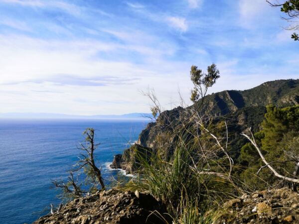 Nach rund einer Stunde erreichen wir „Base Zero“, ein Knotenpunkt von Wanderwegen mit Picknicktischen und -bänken und exponierten Aussichtspunkten. Ab hier beginnt der Abstieg nach San Fruttuoso. Und der ist deutlich rauer als der Wanderweg bis hierhin. Bei Nässe kann’s rutschig werden. Und auf dem Rückweg wird uns der recht steile Anstieg ein wenig Puste kosten. Aber vorher erwartet uns noch der Höhepunkt der Tour – für den wir jetzt tief absteigen.