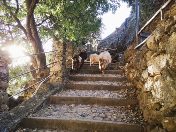 Wir sind spät dran an diesem Wintertag. Kein Mensch zu sehen, die Cafés haben geschlossen. Dennoch sind die Gassen belebt – mit einer Handvoll scheuer Ziegen mit langem Fell und ebensolchen Hörnern. Wunderschöne Tiere, die unsere Annährungsversuche nicht überzeugen. Ängstlich gehen sie auf Distanz. Da hilft es auch nicht, dass unser Hund außer Sicht bleibt.