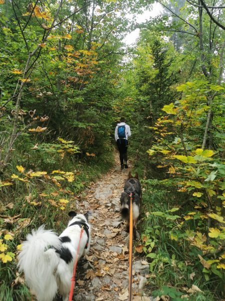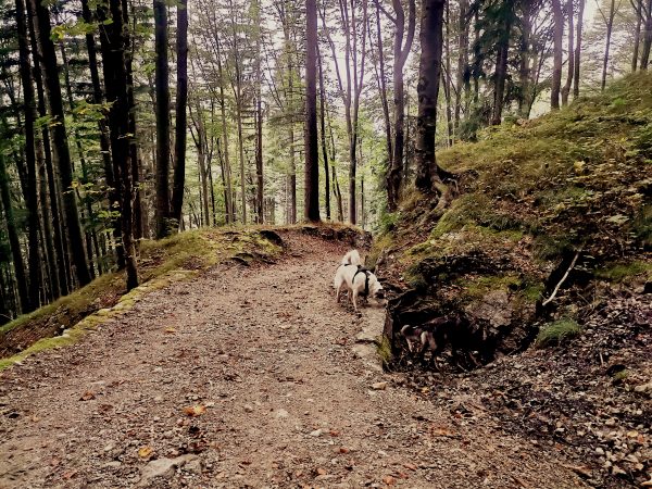 Wir starten am Parkplatz Nähe Huben, überqueren die Straße und gehen gleich mal gut bergauf. Dann geht es etwas auf einer Forststraße weiter, bis man wieder auf einen Wiesen- und Waldweg gelangt.