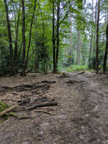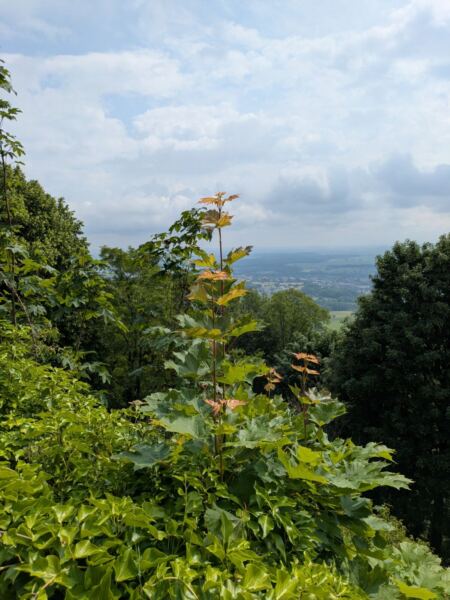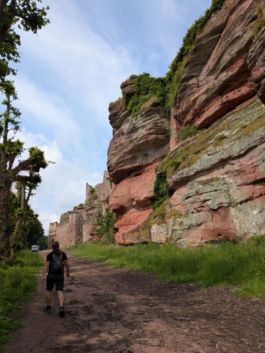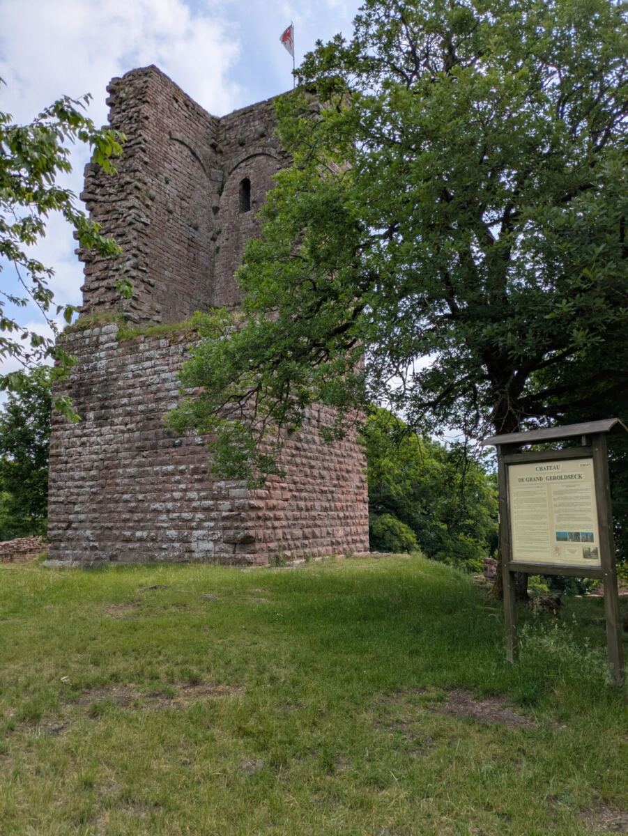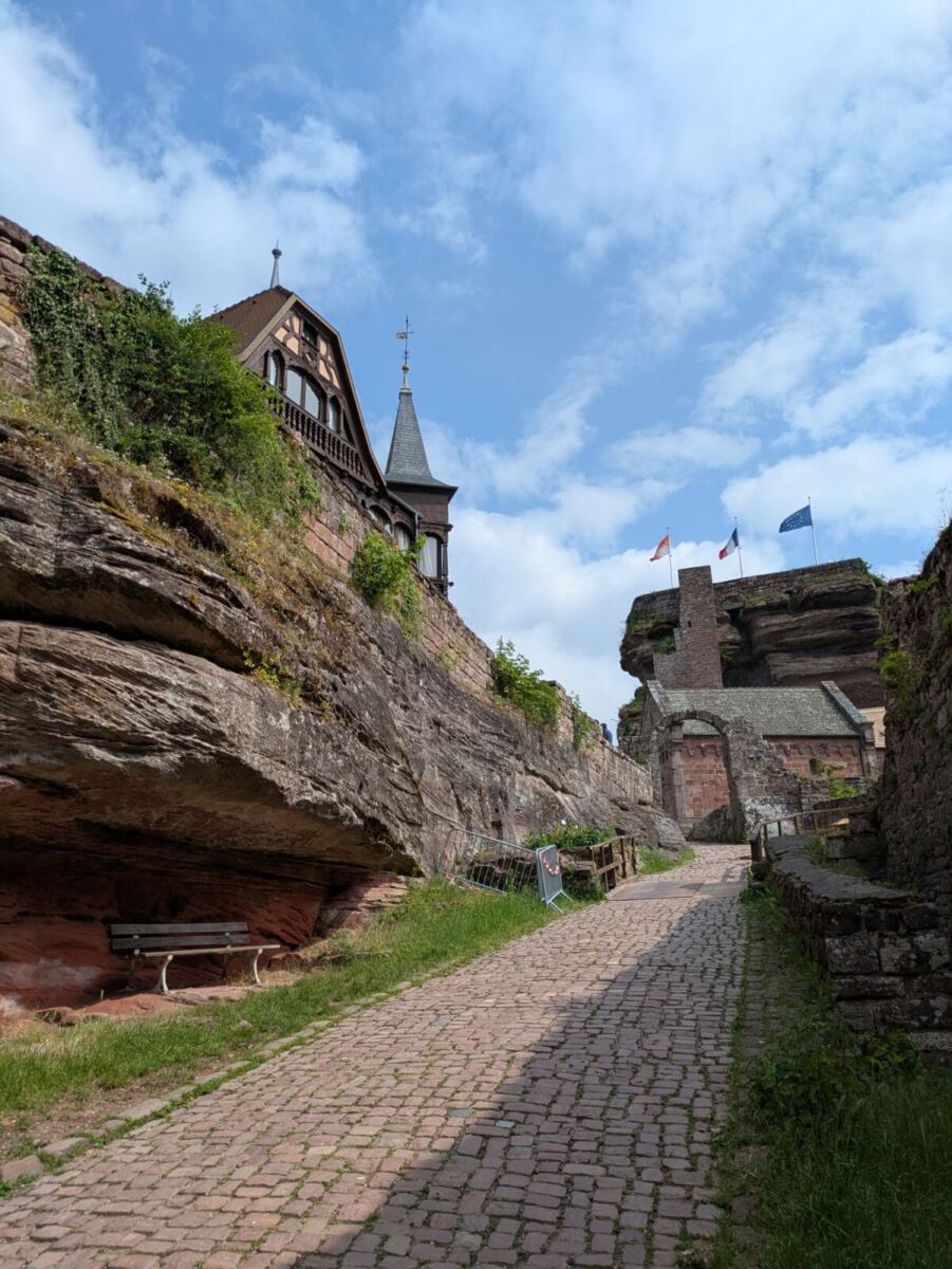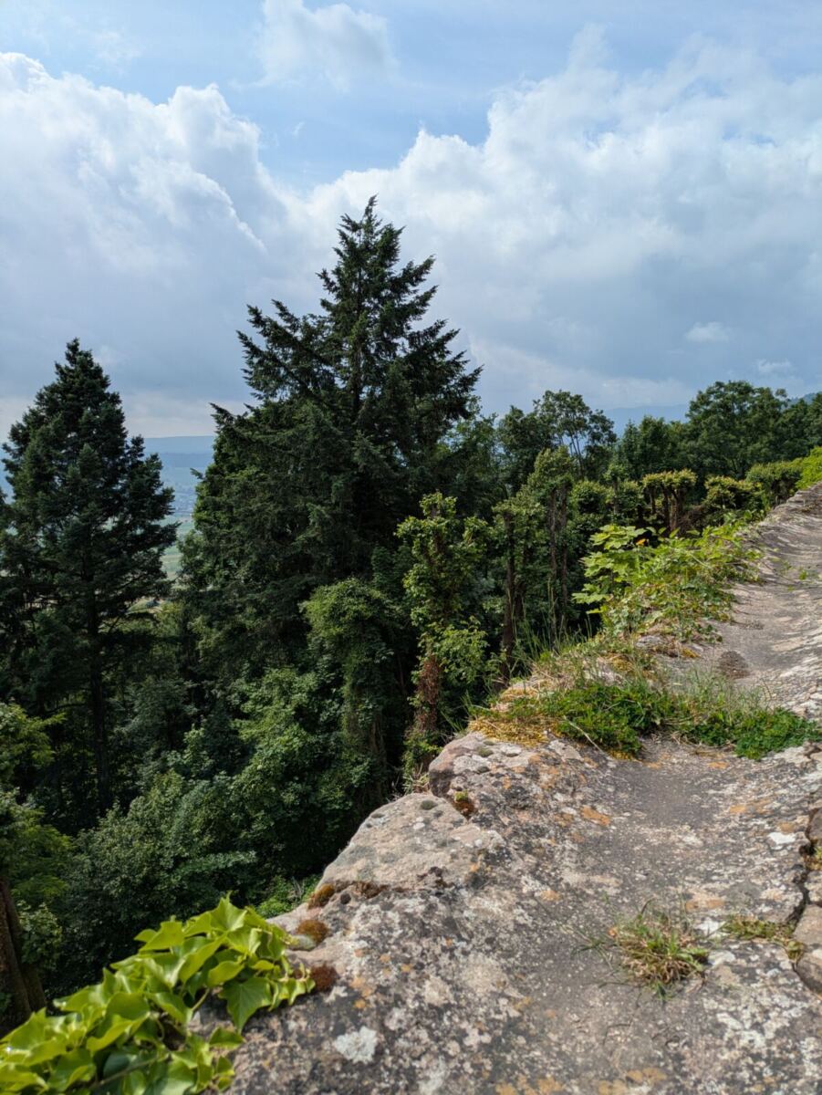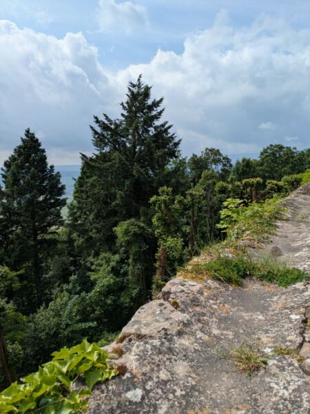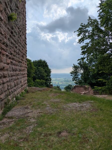 Nach dem Verlassen der bebauten Umgebung beginnt der Aufstieg in den bewaldeten Bereich der Vogesen. Der Weg verläuft größtenteils auf gut befestigten Forst- und Waldwegen, die gleichmäßig ansteigen. Die erste Etappe führt zur Burgruine Château du Petit Geroldseck, die auf einem Felsvorsprung liegt und über einen kurzen, etwas steileren Abschnitt erreichbar ist. Die Ruine selbst ist frei zugänglich und bietet eine tolle Aussicht auf die umliegenden Höhenzüge. In der Anlage liegt auch das Restaurant „La Haute„. Für eine Pause sind wir allerdings zu früh dran, es öffnet erst um 12 Uhr, wir sind eine Stunde früher dran. Vielleicht ist das auch der Grund, dass der große Parkplatz vor der Anlage noch fast leer ist. Auf dem Rückweg kommen wir nochmal daran vorbei, da ist schon deutlich mehr los.