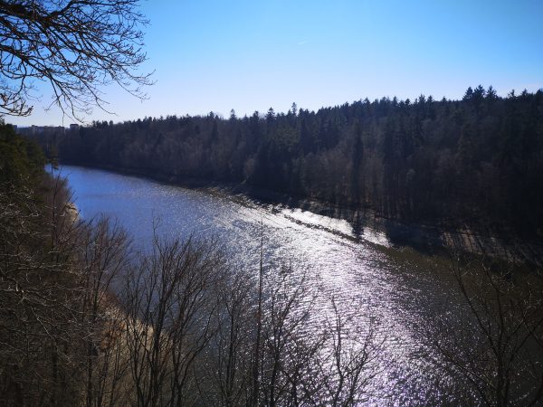 Der schmale und weiche Pfad windet sich durch lichten Birkenwald, immer wieder bietet sich eine tolle Aussicht über den Fluss.