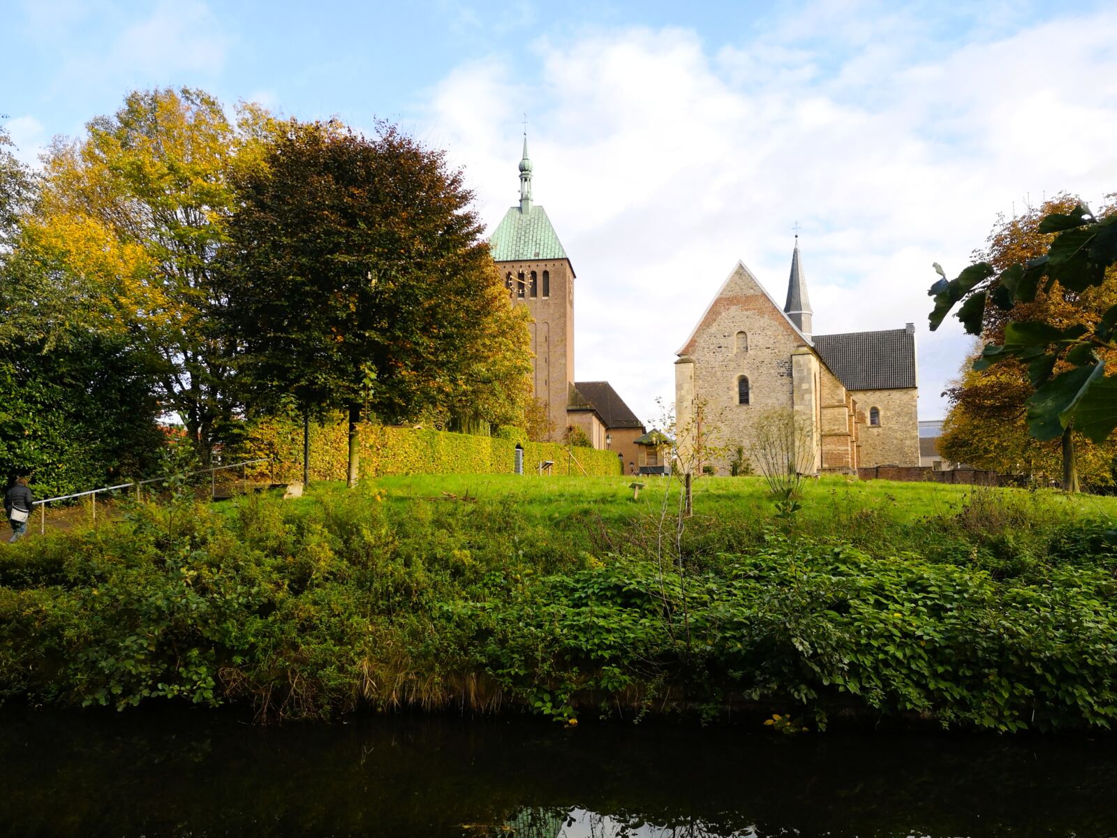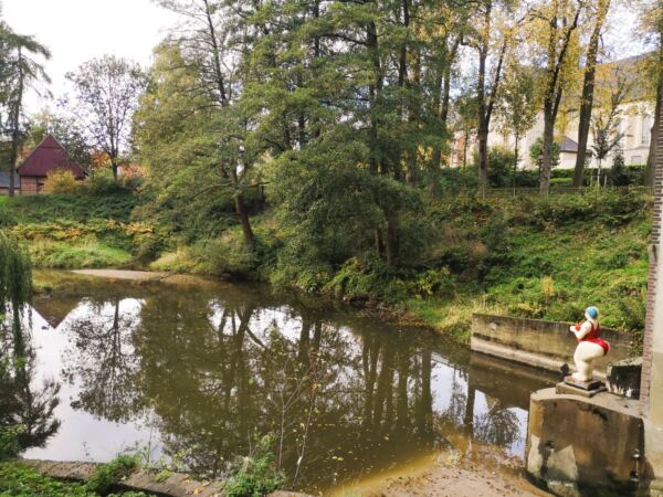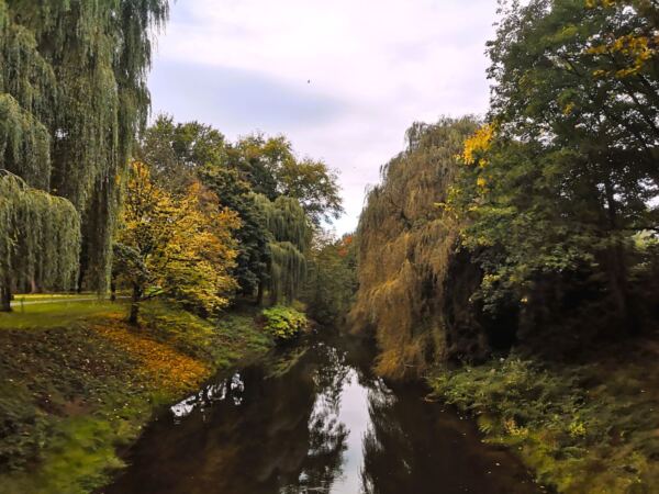 🗺️ Startpunkt unseres Spaziergangs ist der große Parkplatz an der Hamaland-Sporthalle an der Straße Up de Bookholt 10. Wir orientieren uns am Kirchturm, der aus dem Grün herausragt. In diese Richtung laufen wir – und stehen bald an der Berkel. Hier halten wir uns links. Es geht immer an der Berkel entlang. Bald schon zeigt sich die Hofanlage am gegenüberliegenden Flussufer. Unter Bäumen folgen wir der Berkel. Schließlich passieren wir das Flüsschen über die Rote Brücke. Links von uns liegt eine Hundefreilauffläche. Mit verspielten Vierbeinern einen Zwischenstopp wert. Wir hingegen halten uns rechts und folgen der Berkel Richtung Stadtpark.