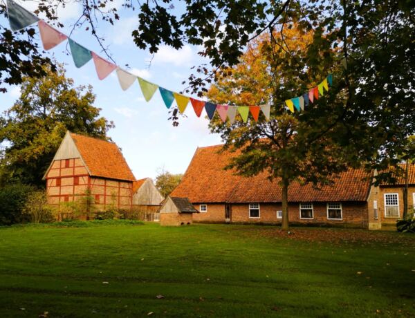 Im westlichen Münsterland, nur einen Steinwurf von der niederländischen Grenze entfernt, liegt Vreden. Ein Bummel durchs Städtchen lässt sich wunderbar mit einem Hundespaziergang an der Berkel und dem Besuch des Bauernhausmuseum verbinden. Das Museum, auch bekannt als „historische Westmünsterländische Hofanlage“ liegt sehr malerisch unter alten Bäumen auf einer Wiese am Fluss mitten im Stadtpark.  Zur Hofanlage gehören Haupthaus, Backspeicher, Kornscheune und Bienenhaus, außerdem Schmiede und Wassermühle, beide noch funktionstüchtig. Die Hofanlage ist frei zugänglich, man kann einfach hindurchspazieren – und dann mit Hund immer weiter an der Berkel entlanglaufen.  Ein Spaziergang durch die Geschichte. Für Münsterland-Urlauber*innen mit Hund absolut empfehlenswert. 🐕👨‍🌾