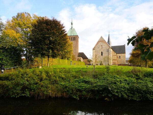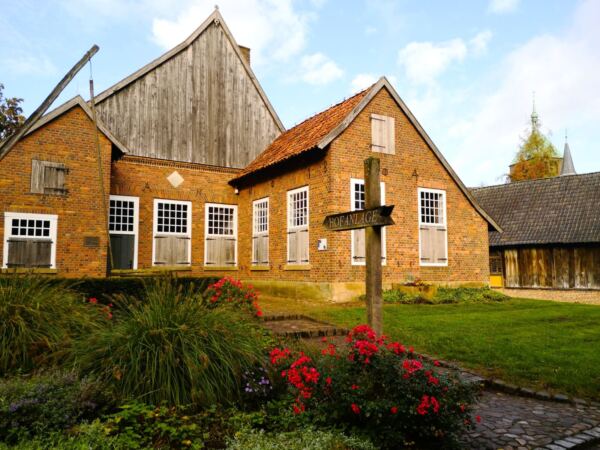 Wir überqueren erneut die Berkel an der Widukindstraße und laufen Richtung Parkplatz. Bei nächster Gelegenheit nehmen wir links die Brücke über die Berkel – und erreichen nach wenigen Schritten die Hofanlage. Wir streifen um die Originalbauten, die vom Leben und Arbeiten der Bauernfamilien im Münsterland erzählen.  Nach einem Abstecher auf dem Marktplatz von Vreden, der gleich hinter der Kirche am Stadtpark liegt, überqueren wir die Berkel hinter dem historischen Wasserkraftwerk und dem Museum „Kult“. Durch den Stadtpark geht‘s zurück zum Ausgangspunkt.