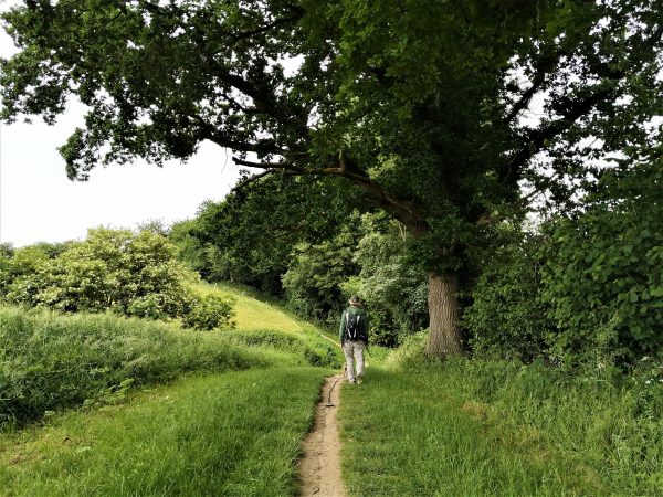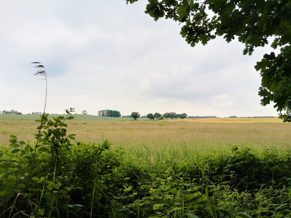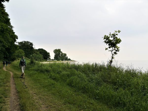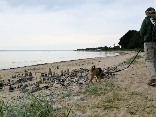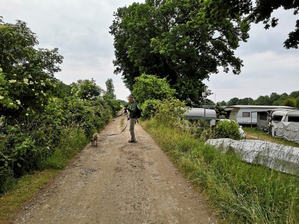 Unsere kleine Wanderung führt entlang zwischen Feld und Meer. Dabei queren wir viele, meist sehr plastiklastige Campingplätze. Aber ist ja immer spannend zu sehen, wie andere Leute wohnen. 🙂 Viele Abstecher an den diversen Hundestränden unterwegs sind auch drin. Schotterwege, Sand und Waldpfade wechseln sich ab. Viel Sonne, wenig Schatten.