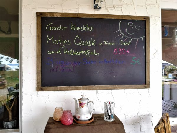 Wer auf dem Campingplatz Gut Karlsminde Urlaub macht und sich zu Mittag- oder Abendessen gerne mal bekochen lassen mag, kann zum Beispiel nach Camp Langholz wandern und dort in der chillig-hippen „Strandräuber Spelunke“ einkehren. Wer noch Puste hat (unser Welpe nicht mehr), sollte von hier aus noch zur schönen Steilküste von Langholz vorlaufen. In umgekehrter Richtung geht’s auch, denn das „Strandrestaurant Karlsminde“ auf dem Gelände des Campingplatzes Gut Karlsminde bietet großartige Küche, regional und saisonal.