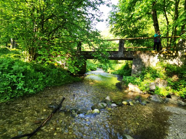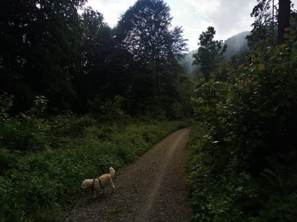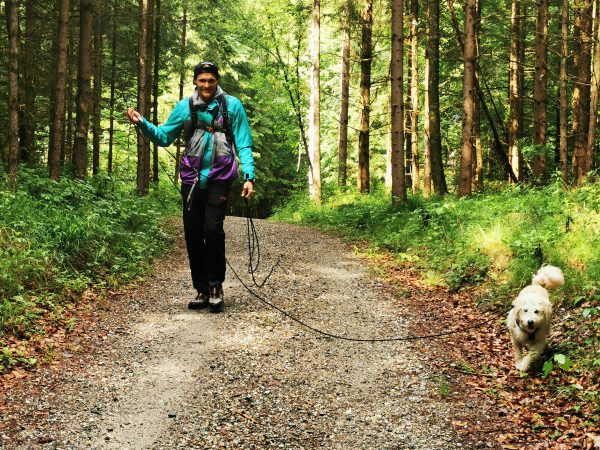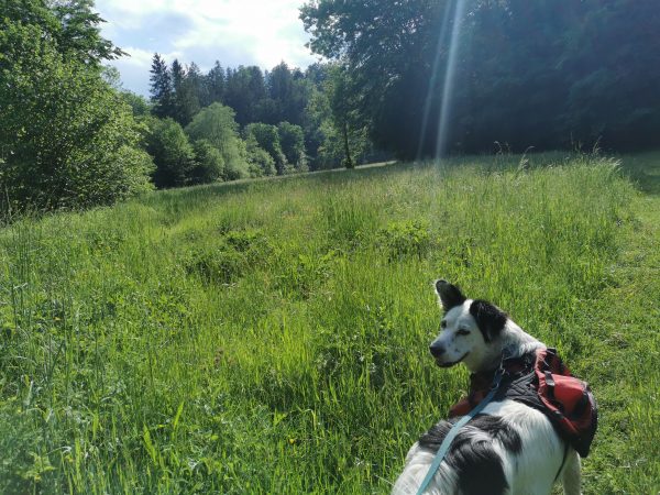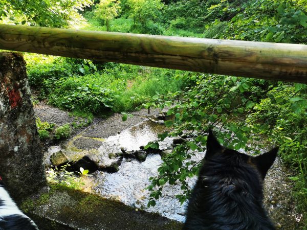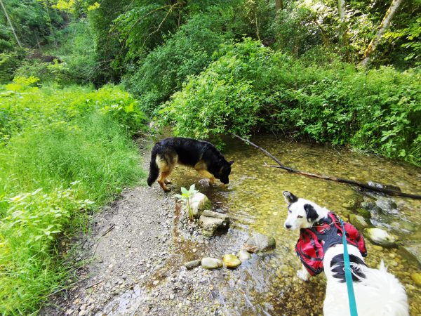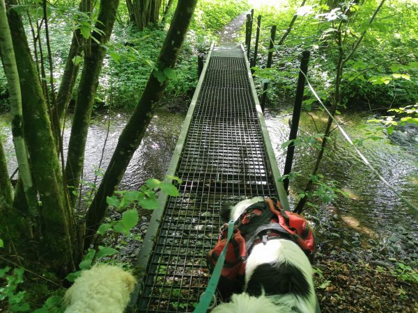 Einmal muss man einen Bach überqueren: entweder man watet durch das Wasser oder nutzt eine Brücke, die aus Gittern besteht (manche Hunde mögen das gar nicht; siehe Fotos).