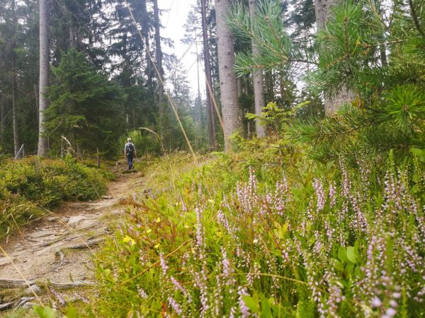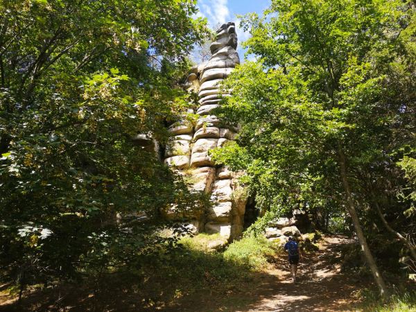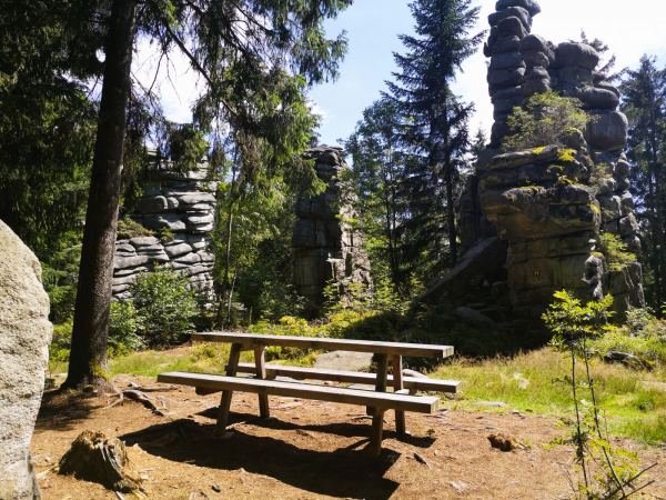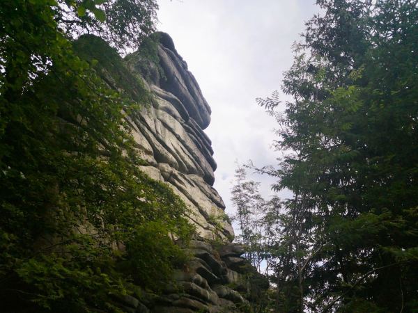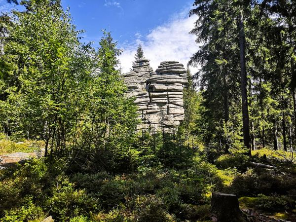 Weiter geht`s Richtung Süden, zunächst wenige Meter bergab, dann weiter in der Ebene. Auf einem steinigen Waldpfad erreichen wir wenig später die Drei-Brüder-Felsen. Der Sage nach sollen drei Brüder von der Burg auf dem Rudolfstein vertrieben worden sein. Sie flüchteten – und wurden an dieser Stelle in Stein verwandelt. Und tatsächlich sehen die Felstürme märchenhaft aus.