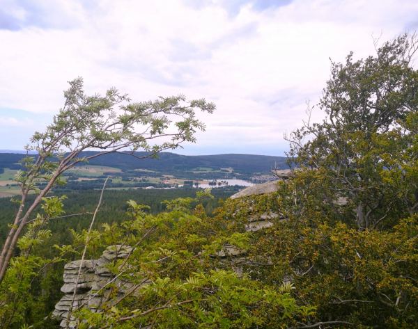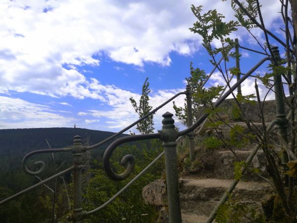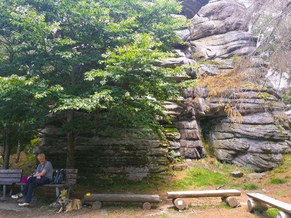 Immer weiter der 3 folgend, steigen wir mal mehr, mal weniger steil den Wald hinauf. Der Weg wird immer steiniger. Schließlich erreichen wir den Rudolfstein. Die gewaltige Felsformation erinnert an eine Burg. Tatsächlich waren die Felsen auch einmal Teil einer mittelalterlichen Festung. Davon ist zwar nichts mehr zu sehen, doch der Rudolfstein beeindruckt uns trotzdem. Seinen höchsten Punkt lässt sich über eine Gittertreppe erklimmen (oder mit Hilfe von Seilen. Hier sind viele Kletterer in der Wand). Von hier oben fliegt der Blick hinüber zum Schneeberg und hinunter über den Weißenstädter See. Amos bleibt derweil mit Herrchen unten. Nachdem sich einer unserer Hunde mal eine Kralle in einem Gitter abgerissen hat, sind wir hier lieber vorsichtig. Am Fuß des Rudolfsteins stehen etliche Bänke und ein Tisch. Ein schöner Ort für eine Rast.