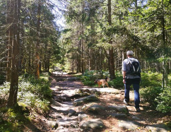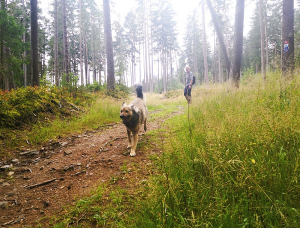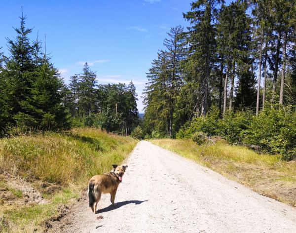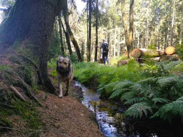 Unsere Wanderung ist durchgehend sehr gut beschildert. Wir folgen immer der schwarzen 3 im gelben Kreis. Unter Füßen und Pfoten: überwiegend sandige bis knorrig-steinige Waldpfade. Wenige kurze Abschnitte auf geteertem Weg. Sonne und Schatten wechseln sich ab. Unterwegs bietet sich unserem Hund immer wieder Gelegenheit, in Bächen und Weihern aufzutanken. Wer keine Brotzeit dabei hat, kann beispielsweise im Landgasthof Birkenhof kurz vor dem Ziel einkehren. Wir haben hier supergute regionale Küche genossen (Amos empfiehlt den Hirschbraten 😊).