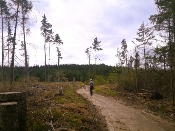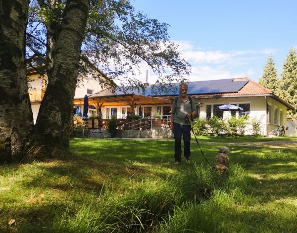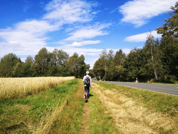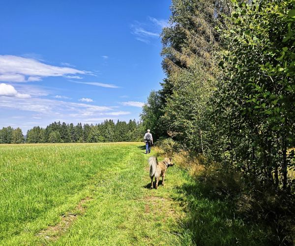 Wir laufen weiter geradeaus und erreichen nach einem knappen halben Kilometer den Rudolfsattel. Hier biegen wir rechts ab und folgen dem Verbindungsweg bis zum (ausgeschilderten) Vogelbeerbaum. Unsere schwarze 3 leitet uns. Wieder geht`s rechts ab. Wir folgen einem breiten Forstweg bergab in Richtung Schönlind – und laufen einer Gruppe von Lamas nebst Anhang fast in die Hufe. Hier werden geführte Wanderungen angeboten. Wir setzen unseren Weg fort und machen einen Abstecher im Landgasthaus Birkenhof (hier auch Übernachten mit Hund möglich). Satt und zufrieden geht`s zwischen Wiesen und Wald zurück zum Weißenstädter See, ein kurzes Stück an der Bundesstraße. Über den Parkplatz der Therme „Siebenquell Gesundzeitresort“ und durch die Unterführung erreichen wir unseren Ausgangspunkt.