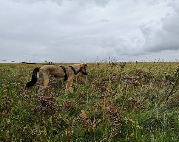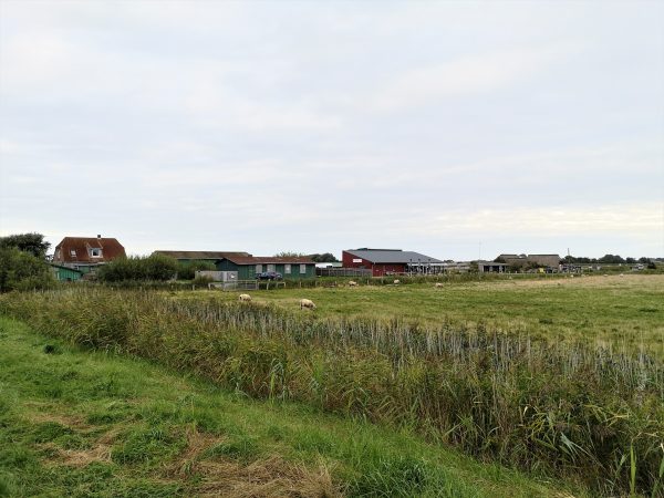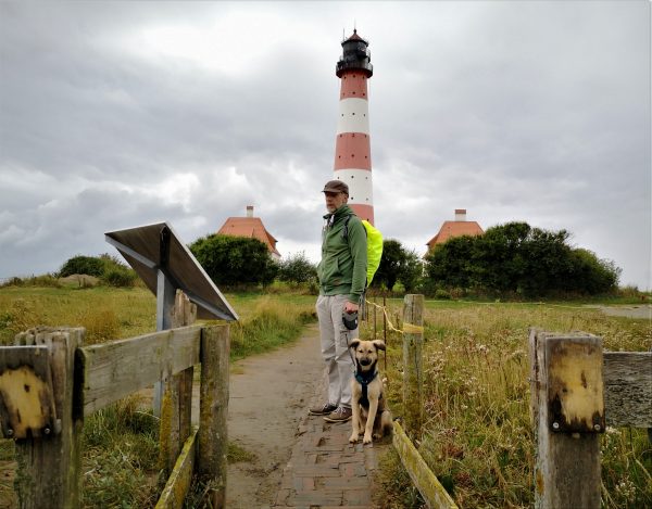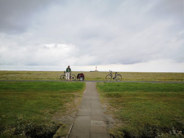 Wie fast überall im Nationalpark gilt auch hier Leinenpflicht. Null Schatten, an einem heißen Tag also ungeeignet für den Wauzi. Westerheversand lässt sich auch prima mit Rad und Hundeanhänger erreichen. Immer am Deich lang. An der kurzen Leine darf der Vierbeiner auch auf den beweideten Flächen neben dem Rad laufen.