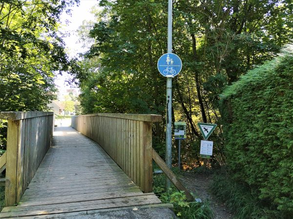 Rechts ab vor der Brücke startet der Wanderweg am Wasser entlang.