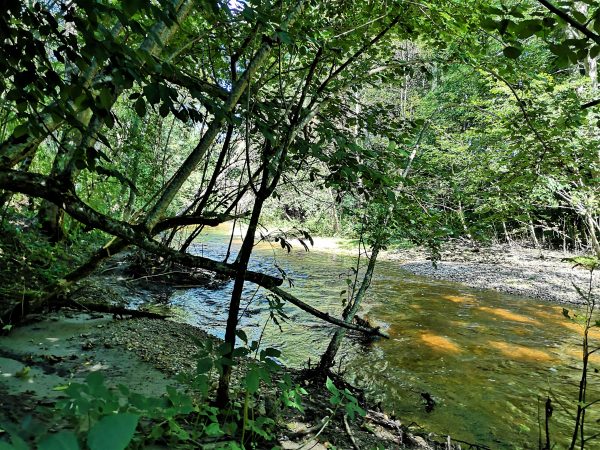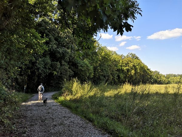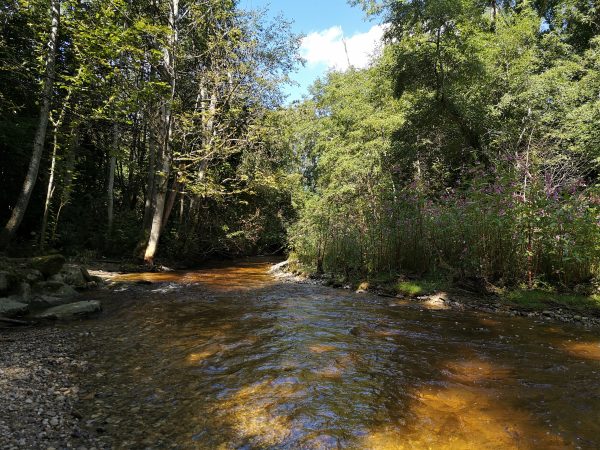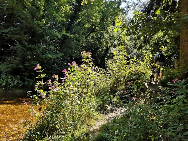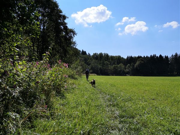 Tobestrecke über die Wiesen, bevor der Weg wieder zum Fluss führt.