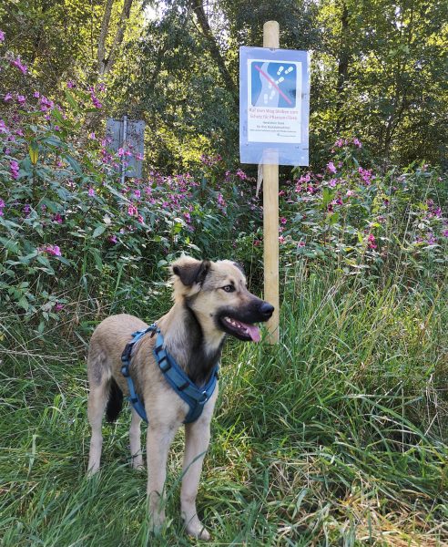 Unübersehbar mahnen Schilder, auf den Wegen zu bleiben, nicht zu radeln und am Wasser den Wauzi an die Leine zu nehmen.