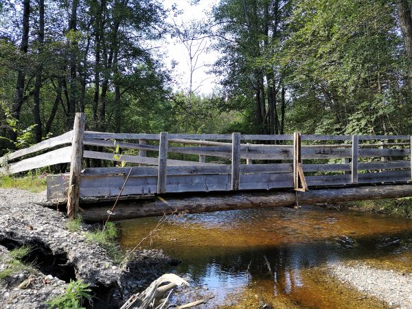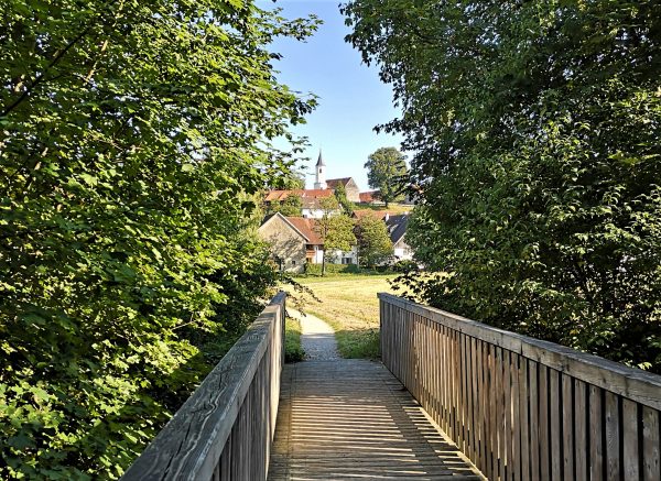 Blick zurück über die Brücke, die uns auf dem Rückweg wieder über die Windach führt. Hier stehen wir nun wieder an unserem Ausgangspunkt.