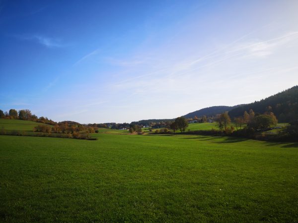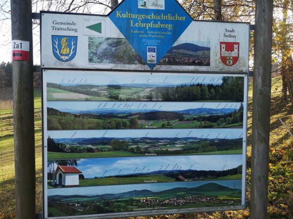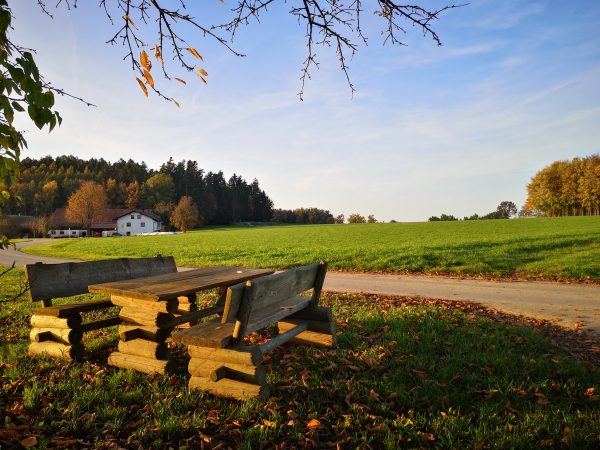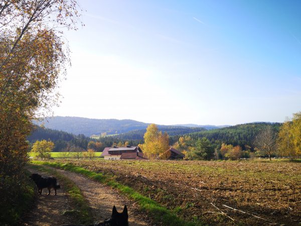 Nach einem kurzen Stück an der Hauptstraße biegen wir auf einen kleinen Weg ab, um eine Koppel herum. An einem Pausenplatz steht hier eine Infotafel über den Bayerischen Wald. Dann geht es über einen schmalen und wurzeligen Weg weiter Richtung Birnbrunn. Hier gäbe es auch die Möglichkeit einzukehren. Wir sind leider schon spät dran und machen uns lieber auf den Rückweg, über Nasting, Kagerhof und Kühberg und Harrling zurück nach Zandt.
