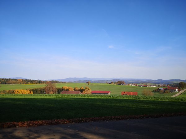 Dann geht es auf eine Anhöhe und von nun an übers freie Feld. Der Aufstieg wird auch direkt durch einen tollen Blick über den Oberpfälzer Wald belohnt. Ab hier führt ein längerer Abschnitt über asphaltierte Straßen. Uns hat es nicht weiter gestört: An diesem sonnigen Tag hat man einen herrlichen Weitblick und tatsächlich kam uns auf diesem Abschnitt kein einziges Auto entgegen.
