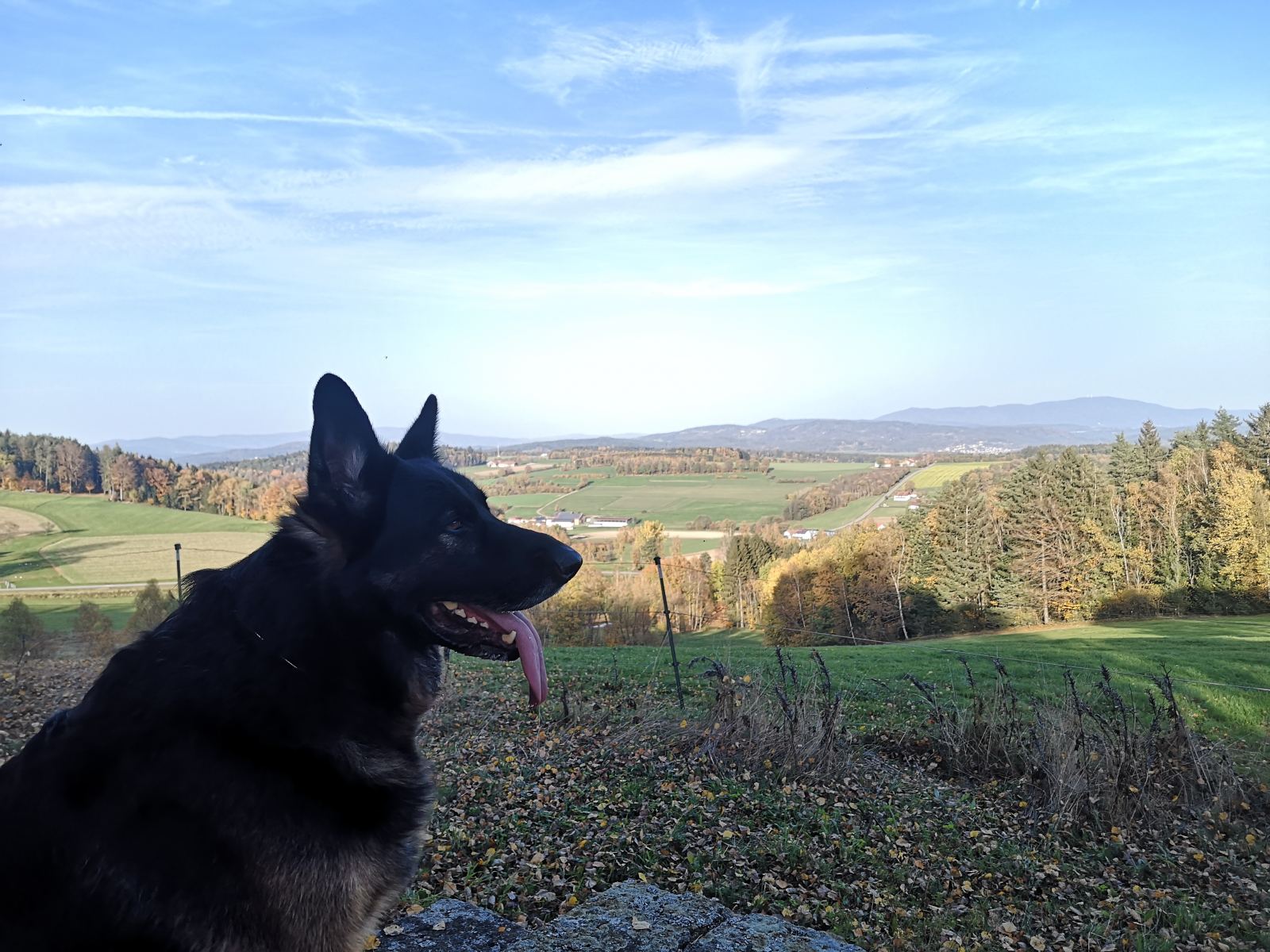 Wir laufen Richtung Kühberg, dabei entdecken wir in der Ferne unter anderem den Gipfel des Großen Arber. Wir nutzen eine Bank für eine kurze Pause mit Ausblick, dann geht es weiter.