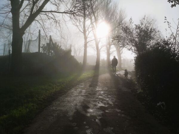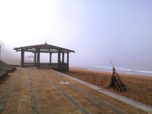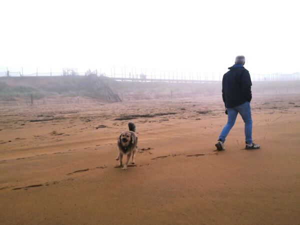 Über eine steile, aber gut befestigte Treppe steigen wir hinab zur Bucht. Auch durch die Nebelsuppe erkennen wir, wie schön sie ist. Wir laufen am Strand entlang. Wären wir in der Hunde-am-Strand-verboten-Zeit unterwegs, würden wir hier auf den Holzsteg wechseln, der zwischen Strand, Biotop und Golfplatz entlangführt. Wir bleiben am Meer. Amos fegt über den roten Sand.