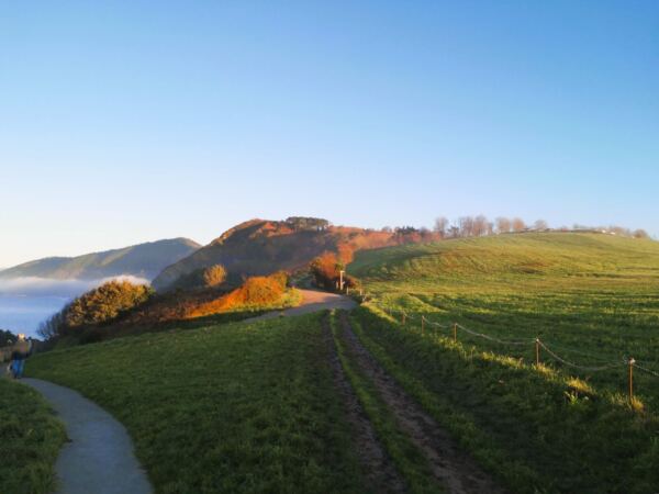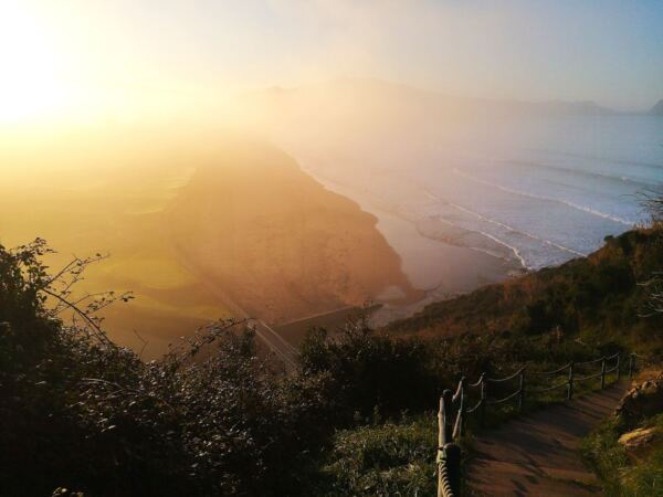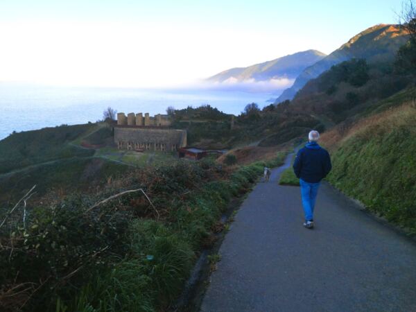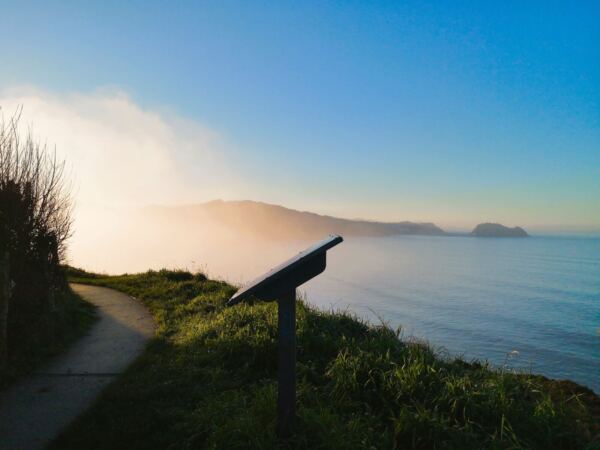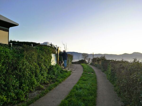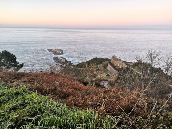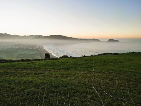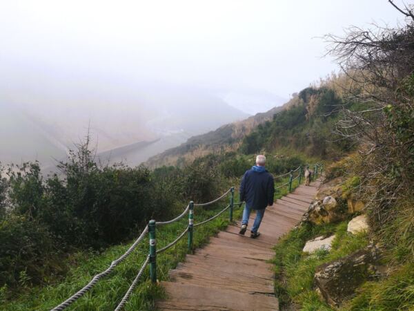 Ausgangspunkt unserer Tour ist der Campingplatz Gran Camping Zarautz, der auf der Steilküste über der Bucht liegt und wegen seines Ausblicks zu den schönsten ganzjährig geöffneten Plätzen in Spanien zählt. Das glauben wir gerne. Wir wollten gar nicht mehr weg von hier. 😊 Vom Campingplatz laufen wir den Berg hinab Richtung Bucht und Stadt. Noch liegt Hochnebel über dem Meer. Wir hören es, sehen es aber nicht. Wir folgen dem Wanderweg an der nächsten großen Kreuzung geradeaus. Den Abstecher zur Insel Mollarri sparen wir uns für später auf, wenn sich der Nebel verzogen hat.