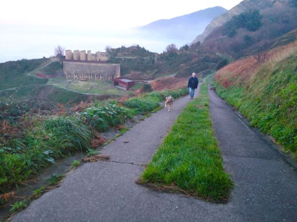 Der Nebel hat sich verzogen. Nach dem Aufstieg über die Treppe erreichen wir die Kreuzung, die wir vom Hinweg kennen. Rechts hoch geht es zum Campingplatz, links hinunter zur Insel Mollarri und den imposanten Mauerresten von Malla Harria. Das gesamte Setting erinnert eher an eine romantische Burgruine an der schottischen Küste als an einen alten Industriestandort.