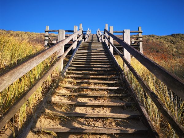 Immer wieder führen Treppen vom Strand hinauf auf den Dünenkamm.