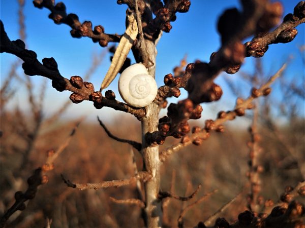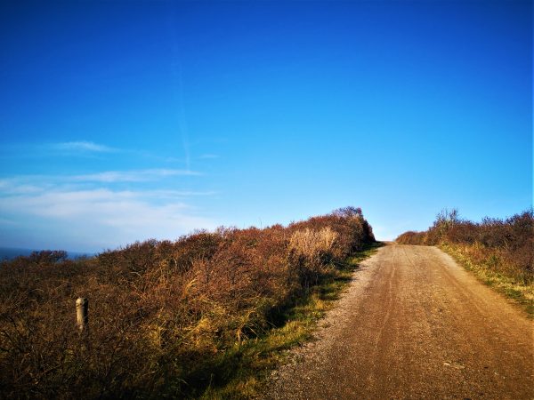 Entlang des Wegs wachsen niedrige Sträucher, Brombeer- und Himbeerhecken. Die Beeren dürfen nicht gepflückt werden. Sie liefern Vogelfutter und Samen für noch mehr Hecken - der beste Schutz gegen Erosion.