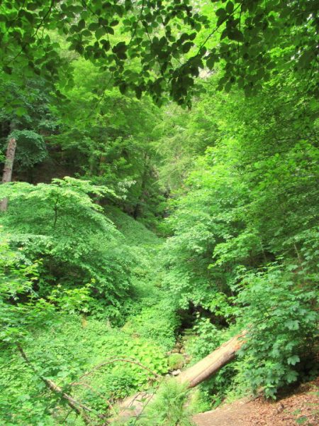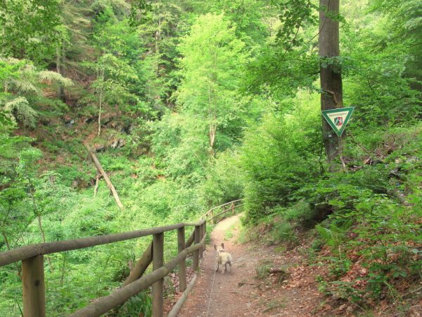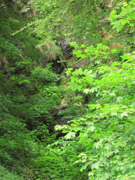 Die Wanderung ist etwas für Geübte und man sollte festes Schuhwerk tragen. Vom Parkplatz in Wasserfall, Aurorastraße, geht es am Campingplatz vorbei und schon steil hinunter, bis zum Wasserfall geht es noch ein gutes Stück weiter nach unten. Unten am Wasserfall gibt es im Schatten eine Bank auf der man sich ausruhen und die Natur genießen kann: So einen Urwald hat man selten gesehen, der Wasserfall ist jetzt im Sommer unter einem grünen Teppich verborgen. Dann geht es zurück, jetzt steil nach oben.