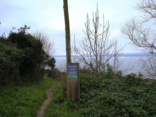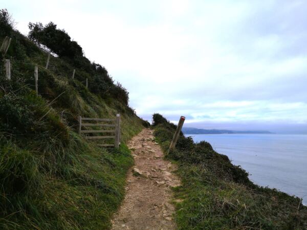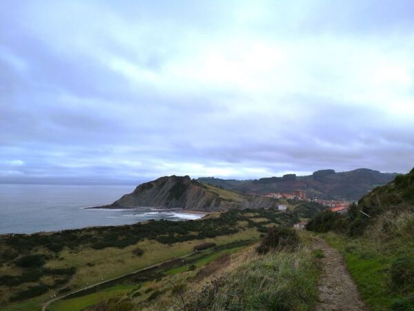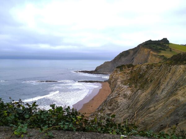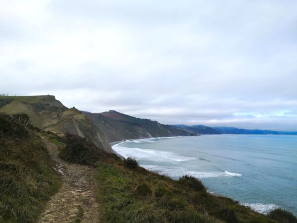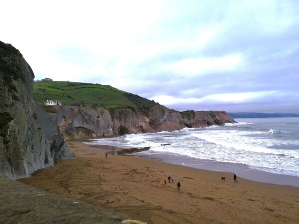 Wir wenden uns stadteinwärts und laufen über die Brücke, die uns über den Fluss Urola bringt. Über den Spazierweg am Flussufer kommen wir schließlich zu nächsten kleinen Brücke und hinein in die Stadt. Wir laufen einige Meter über die Straße Txomin Agirre Kalea Richtung Leuchtturm. Am Amaia Plaza biegen wir links ab. Bergauf auf der San Telmo Kalea erreichen wir schließlich die Kapelle San Telmo Ermita über der kleinen Bucht. Am Strand sind Hunde eigentlich verboten. Doch jetzt, im Dezember, ignorieren die Einheimischen diesen Hinweis. An der Kapelle San Telmo gehen wir zunächst rechts vorbei zum Aussichtspunkt, dann wieder zurück zum Kirchlein. Schon von hier aus eröffnet sich uns ein atemberaubender Blick über die Steilküste mit ihren gestreiften Felsen in unterschiedlichsten Farben. Aufgefaltete Erdgeschichte. Links von der Kirche finden wir den Einstieg zum ausgeschilderten Wanderweg.