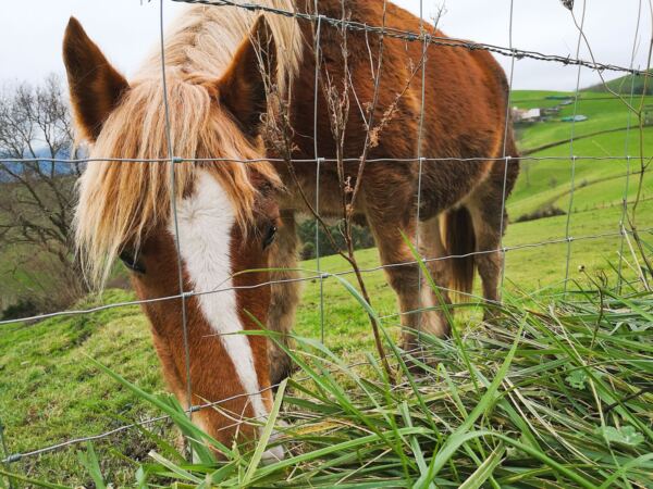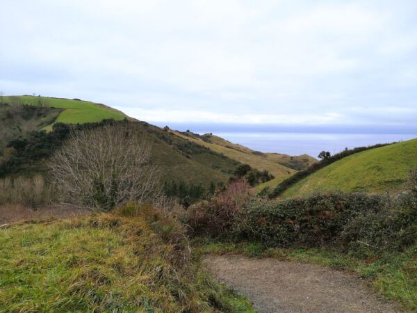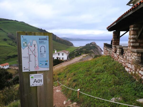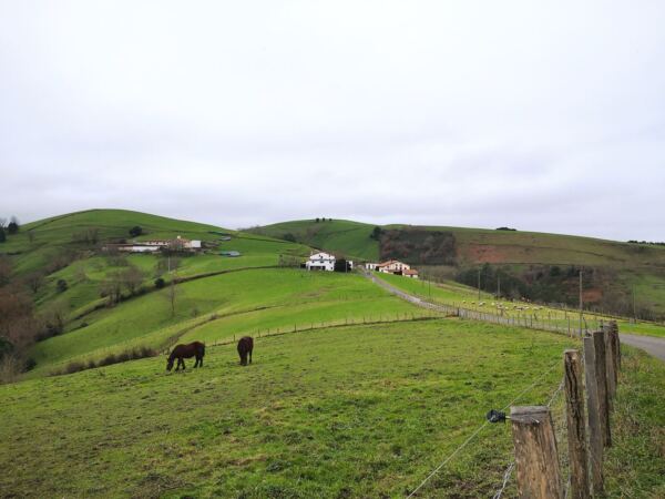 Wir erreichen den Sattel und genießen den Blick in alle Richtungen. Hinter uns das Meer, vor uns Weiden mit Pferden, darüber die Berge. Wer mag, kann von hier aus rechts weiter laufen, über das geteerte Anwohnersträßchen am Bauernhof vorbei zum Rastplatz Elgorriaga mit Bänken und Kiosk wandern und weiter zum Aussichtspunkt Flysch begiratokia – Baratzazarrak, der einen tollen Blick auf die ganze Flysch Küste bietet. Wir hingegen sparen uns den Abstecher, bleiben lieber lange auf der Bank auf dem Bergkamm sitzen und genießen die Aussicht. Der Abstecher hätte uns hierhin zurückgeführt.