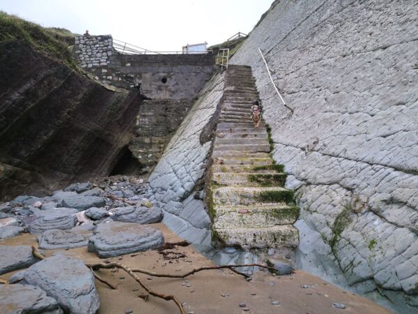 Eine Treppe führt hinab zum Strand der kleinen Bucht Algorri.