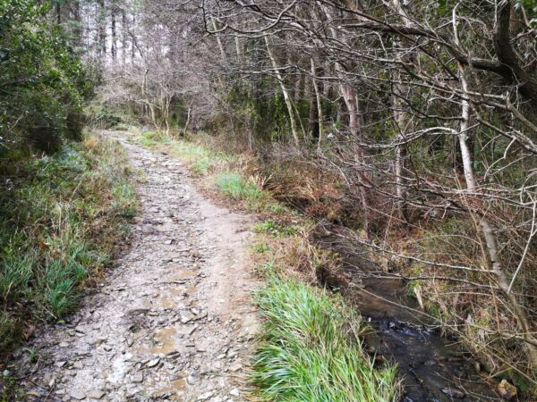 Wir laufen über den Bergrücken immer geradeaus bis zum Mirador de Algorri, der uns Tiefblick auf die gleichnamige Bucht zwischen rotem und grauem Gestein bietet. Dann geht`s bergab und runter zur kleinen Bucht, die sich über eine Treppe erreichen lässt. Wir umrunden die Bucht und folgen schließlich dem schmalen Steig den Berg hinauf. Wir laufen an der Bergflanke entlang, die nach langen Regenfällen supermatschig ist. Amos tobt hindurch, dass der Schlamm nur so spritzt. Für den großartigen Blick über Felsen und Meer nehmen wir den Matsch gerne in Kauf. Der Wanderweg dreht schließlich weg vom Meer und bringt uns neben einem Bachlauf zwischen Wiesen und Weiden den Berg hinauf.