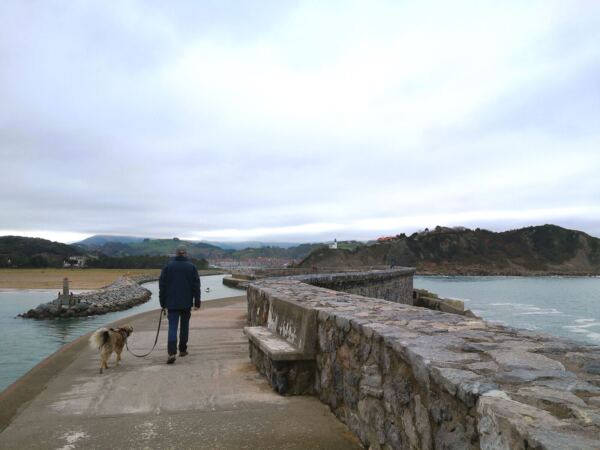 Wir folgen dem Teersträßchen links und bergab Richtung Zumaia. Wenige Meter hinter einer Kirche nehmen wir einen Treppenabgang in die Innenstadt. Am Urola entlang laufen wir vor bis zum Leuchtturm am Meer. Am anderen Flussufer sehen wir viele Menschen mit Hund, die sich an der Playa de Santiago tummeln.