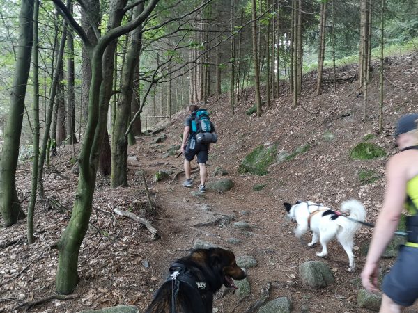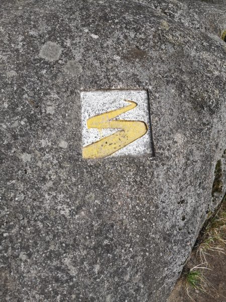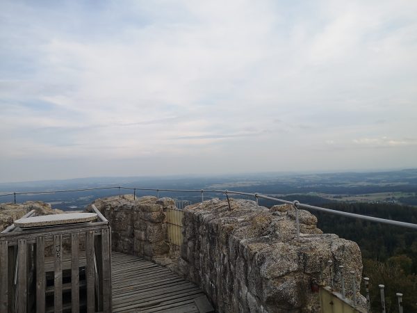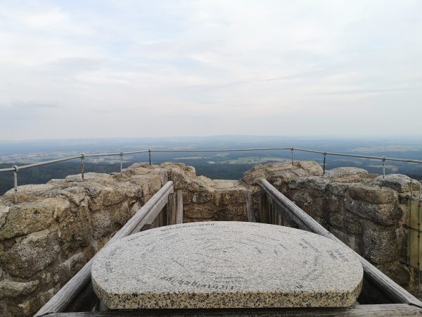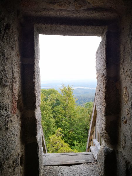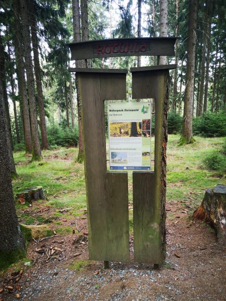 Dann machen wir uns auf den Weg zur Burgruine. Dafür folgen wir dem sehr gut ausgeschilderten Goldsteig (gelbes S auf weißem Grund) durch den Steinwald. Es geht stetig bergauf, am Wegesrand stehen immer wieder Infotafeln, die über die Eigenarten und Besonderheiten des Steinwald informieren.