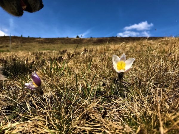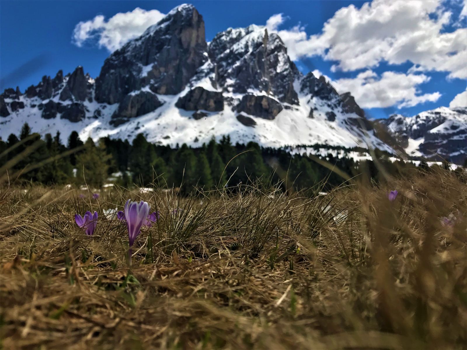 Genialer Kontrast: Der Peitlerkofel, davor Fühlings-Krokusse im Biotop Würzjochmoos.