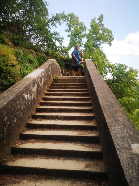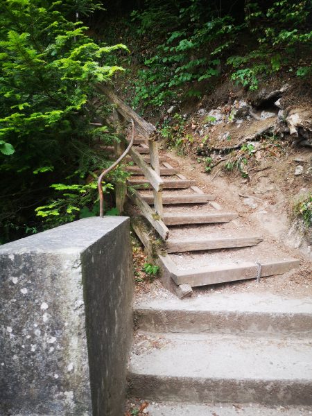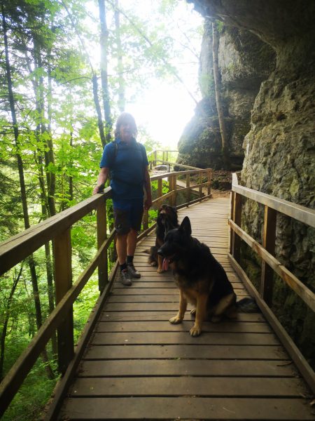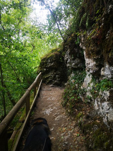 Aber zurück zur Strecke: Wir starten am Parkplatz Teufelsbrücke (gebührenpflichtig). Von dort geht es direkt in den Schatten der Bäume und bald nach links und bergab. Wir schlängeln uns auf einem schmalen Weg entlang steil abfallender Felsen, zum Teil über Holzstege. Dann durchqueren wir ein Felsentor und stehen auf der Teufelsbrücke. Die geschwungene Brücke führt über die fast 20 m tiefer liegende Höll und bietet einen traumhaften Blick über das Donautal.