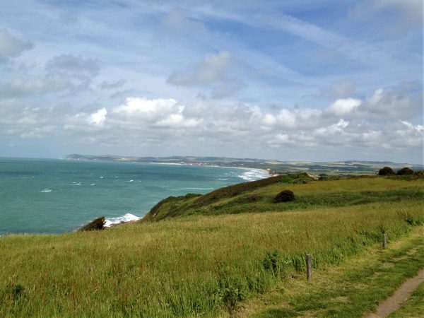 Der Wanderweg führt an Wiesen und Weiden vorbei. Im Hintergrund: Cap Blanc Nez.