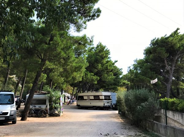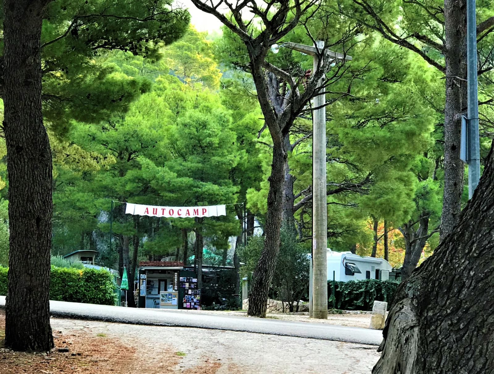 Das „Autocamp Krvavica bietet etwa 50 Stellplätze plus Zeltplätze. Sie liegen auf schön angelegten Terrassen mit Zypressen, Olivenbäumen ujnd blühenden Büschen und überwiegend im Schatten hoher Kiefern und Eichen. Gerade im oberen Teil des Campingplatzes sind die Parzellen sehr großzügig geschnitten.