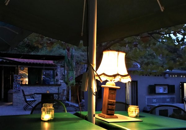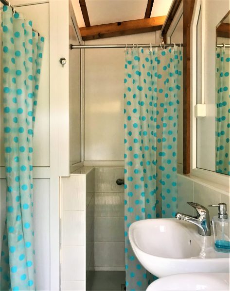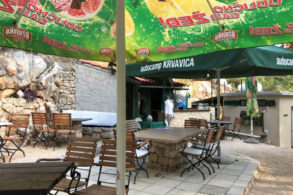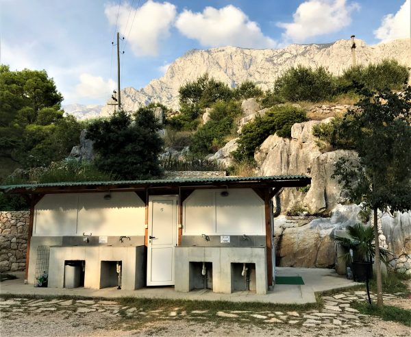 Der Campingplatz bietet keinen Luxus – aber viele liebevolle Details. So sind die Duschen und Toiletten zwar klein, aber sehr sauber. Und mit den blau gepunkteten Duschvorhängen, den stylischen Holzfiguren, die Männer- und Frauenbereich anzeigen, sowie vielen weiteren Details machen sie einfach gute Laune. Eine schön entspannte Atmosphäre herrscht auf der gepflasterten Terrasse mit Tischen, Stühlen, Sonnenschirmen und Lampen. Dort steht ein großer Grill für die gemeinsame Benutzung, außerdem Kühlschränke – was gerade für die Zeltgäste sehr praktisch ist. In der Hauptsaison gibt es gelegentlich dalmatinische Musik und regionales Essen. Auch kommt man mit den anderen Gästen schnell ins Gespräch.
