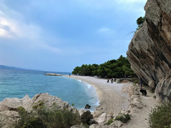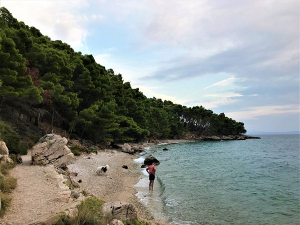 Ihr erreicht ihn über einen wunderschönen Fußweg am Meer entlang Richtung Makarska. Die breite Kiesbucht, auch sie unter hohen Kiefern und Steineichen, schließt sich direkt an den FFK-Strand an. An diesem ruhigen und naturbelassenen Hundestrand dürfen Vierbeiner frei toben, schwimmen und schnüffeln – keine Leinenpflicht, kein Massentourismus. Das Wasser ist kristallklar, der Zugang zum Meer sanft abfallend – perfekt auch für ältere Hunde.