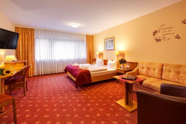 Die Zimmer sind hell und freundlich eingerichtet, die Bäder und auch der Wellnessbereich mit Schwimmbad, Sauna und Infrarotkabine auf modernem Stand. Die Küche hat neben internationalen Gerichten den Fokus auf heimische Gerichte mit regionalen Zutaten gelegt. Auch Vegetarier, Veganer und Allergiker werden hier satt. Dazu darf natürlich ein guter Pfälzer Wein nicht fehlen.