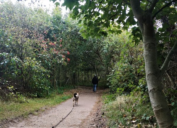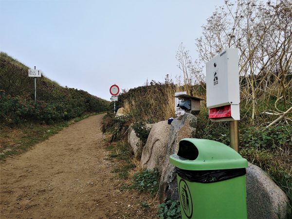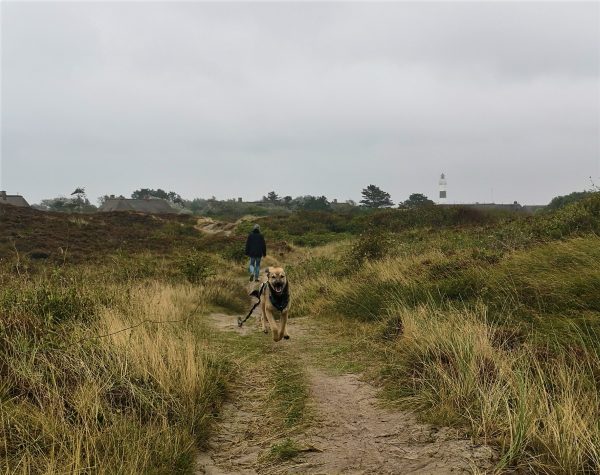 Oft und gerne sind wir vor dem Bohlenweg zum Strand rechts abgebogen auf den schmalen Pfad, der Spaziergänger:innen hinein in die Dünenlandschaft bringt und weiter in den Sylter Sagenwald. Der ist liebevoll angelegt. Installationen und Infotafeln erzählen Märchen und Geschichten aus der Region. Dafür ist man nie zu alt. Und unser Amos konnte sich hier direkt ein bisschen auspowern, an der Schleppleine oder auch mal einfach so. Vom Sagenwald kann man auch direkt weiterlaufen zum geringelten Leuchtturm von Kampen. Am Kreuzungspunkt von Bohlenweg und Wanderpfad in die Dünen hat der Campingplatz eine Servicestation für Hunde aufgestellt. Hier kann man sich also auch gleich mit Kotbeuteln eindecken. Auch das zeigt, wie sehr sich die Campingplatzbetreiber auf Menschen mit vierbeinigen Gästen eingestellt haben.